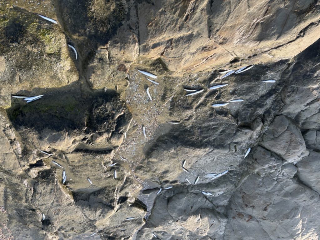 岸際に追われて海に帰れなくなったイワシたち。