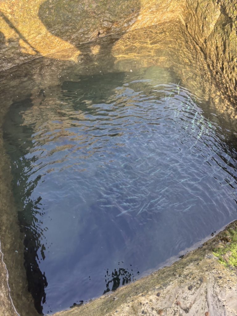 潮位の関係で今は使われなくなった生簀に取り残されたイワシたち。